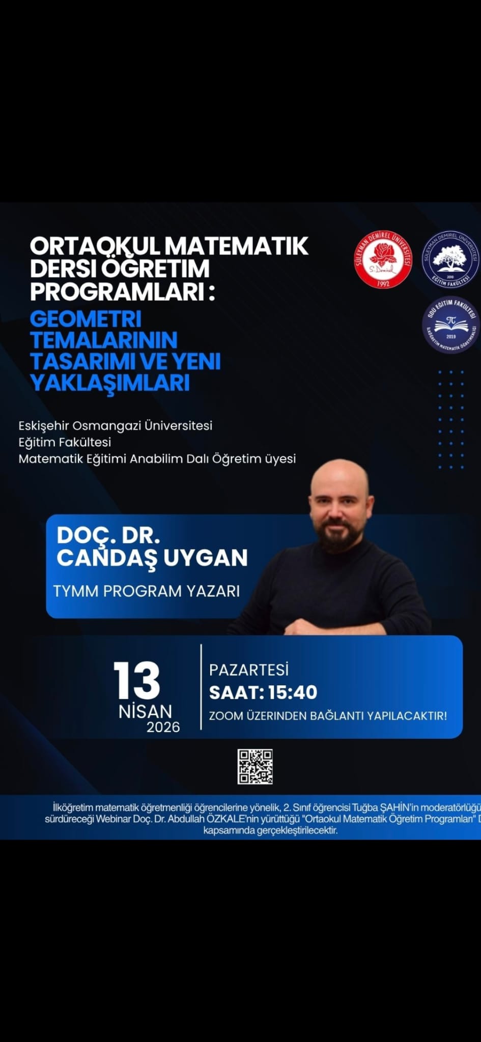 Üniversitemiz İlköğretim Matematik Öğretmenliği Lisans Programında Doç. Dr. Abdullah ÖZKALE tarafından yürütülen Ortaokul Matematik Dersi Öğretim Programları dersi kapsamında, Eskişehir Osmangazi Üniversitesi öğretim üyelerinden ve TYMM program yazarlarından Doç. Dr. Candaş Uygun’un katılımıyla bir webinar gerçekleştirilecektir.