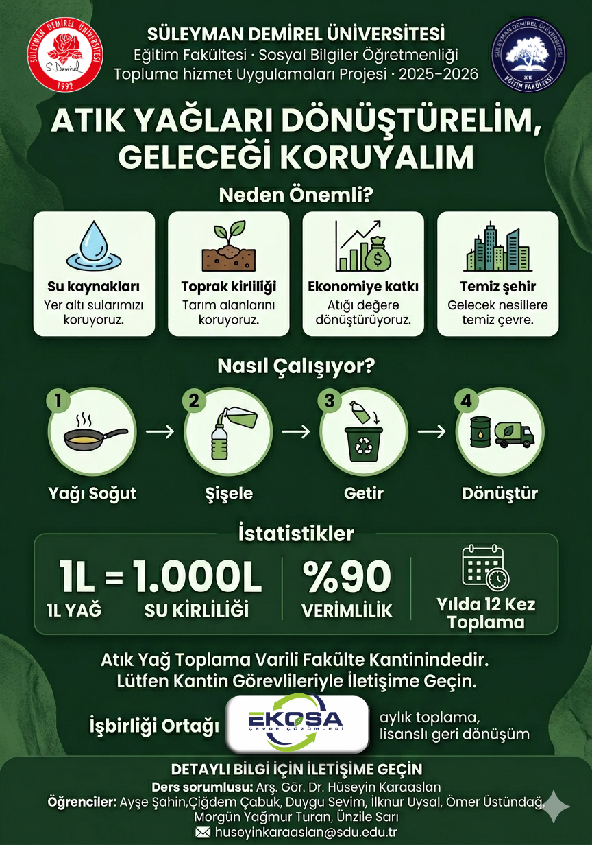 Sosyal Bilgiler Öğretmenliği programı kapsamında yürütülen Topluma Hizmet Uygulamaları dersi çerçevesinde “Atık Yağları Dönüştürelim, Geleceği Koruyalım” projesi başlatıldı.