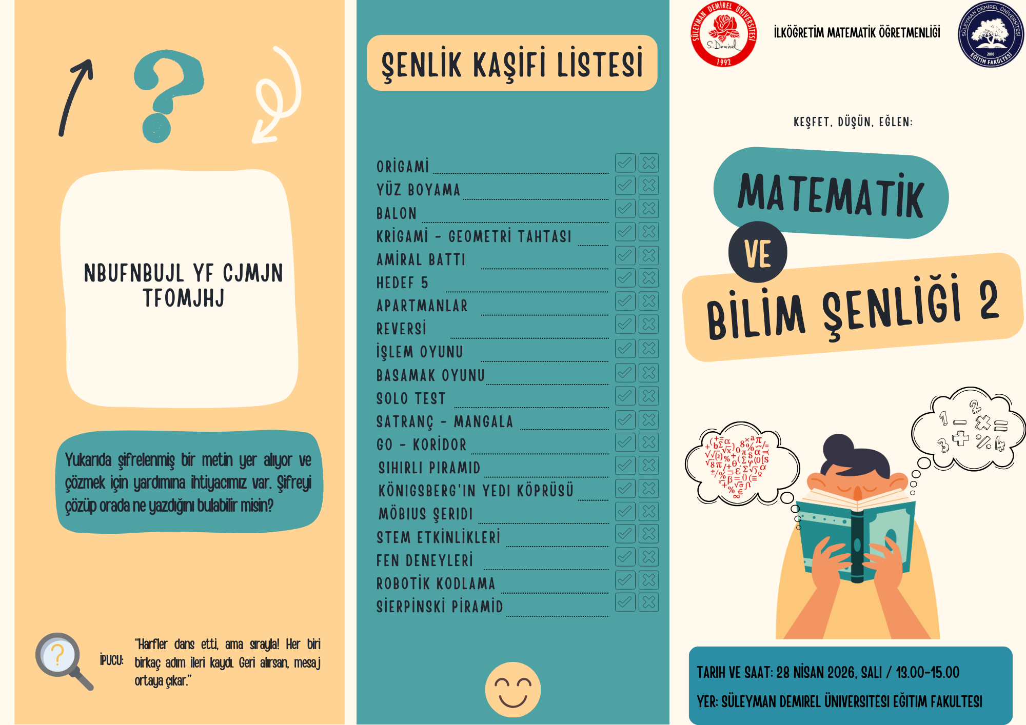 Süleyman Demirel Üniversitesi Eğitim Fakültesi İlköğretim Matematik Öğretmenliği öğrencileri tarafından düzenlenen “Matematik ve Bilim Şenliği 2”, 28 Nisan 2026 Salı günü saat 13.00–15.00 arasında Eğitim Fakültesi’nde gerçekleştirilecektir.