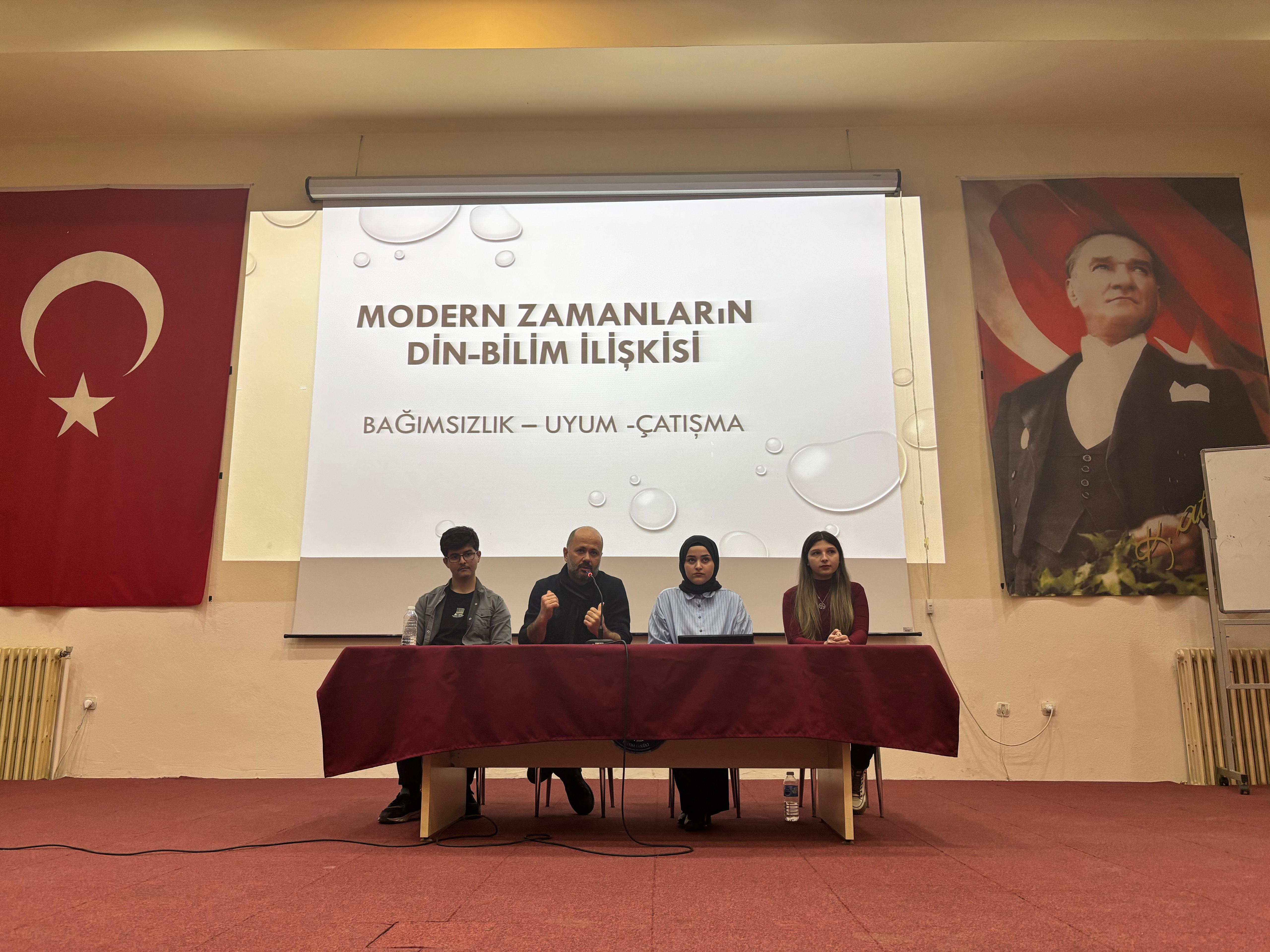 Fen Bilgisi Eğitimi Anabilim Dalı Başkanı Prof. Dr. Halil Turgut tarafından yürütülen "Bilim Felsefesi ve Tarihi" dersi kapsamında, akademik derinliği yüksek bir panel gerçekleştirildi. Fakültemiz öğrencilerinin yoğun ilgi gösterdiği etkinlikte, modern dünyada din ve bilim arasındaki çok boyutlu ilişki ele alındı.